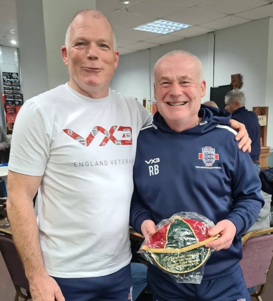 Photos: England Veterans squad. Player/Manager Andy Cranch (left) with Russ Baker and his commemorative Cap. The Port Talbot Town AFC pitch.