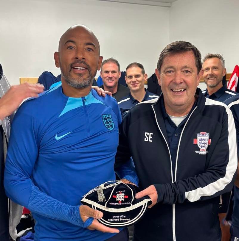 Photo’s: England Veterans’ Over 60’s squad. The Over 50’s enjoy the after match feast. And 50’s Manager, Steve Edkins, presents representative Caps to Stafford Browne and Steve Robinson. Well done gentlemen.
